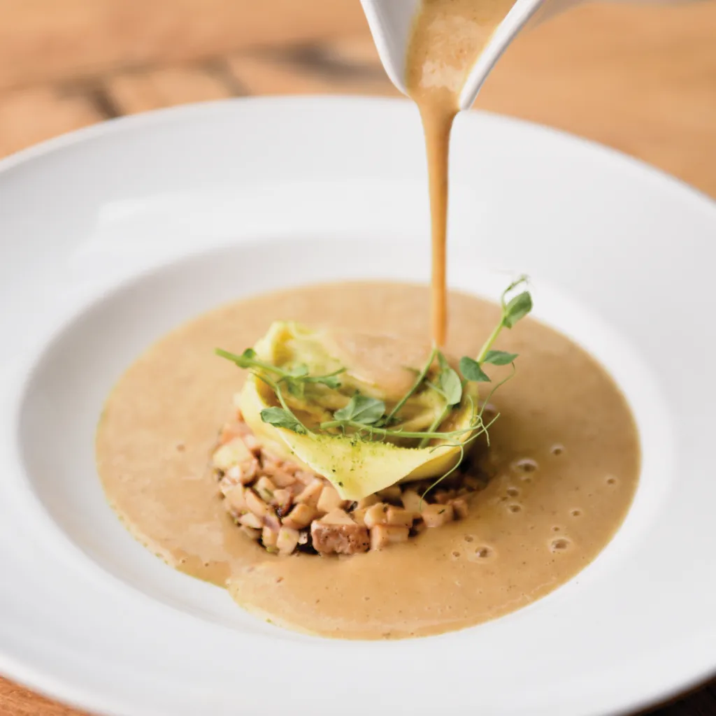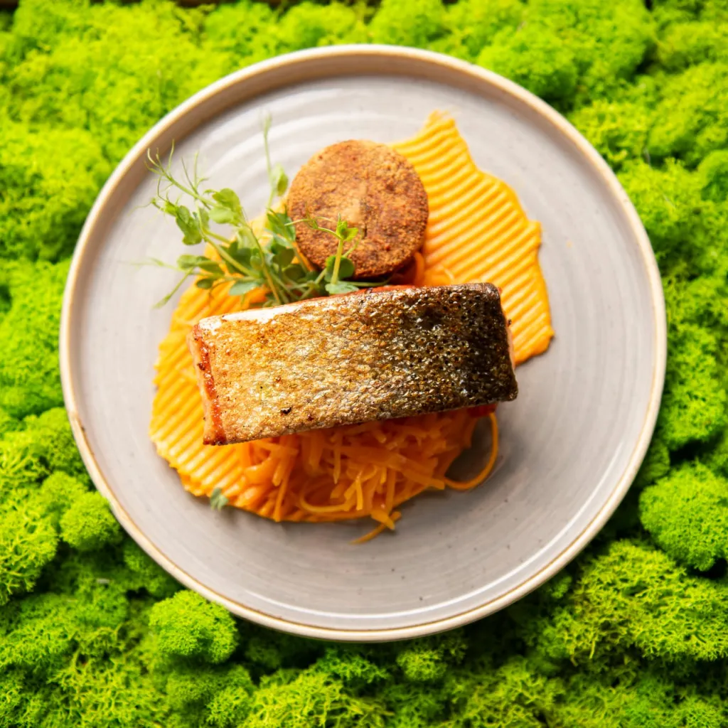 - Počasi kuhana telečja lička / bela polenta, korenčkova krema in pečeno korenje