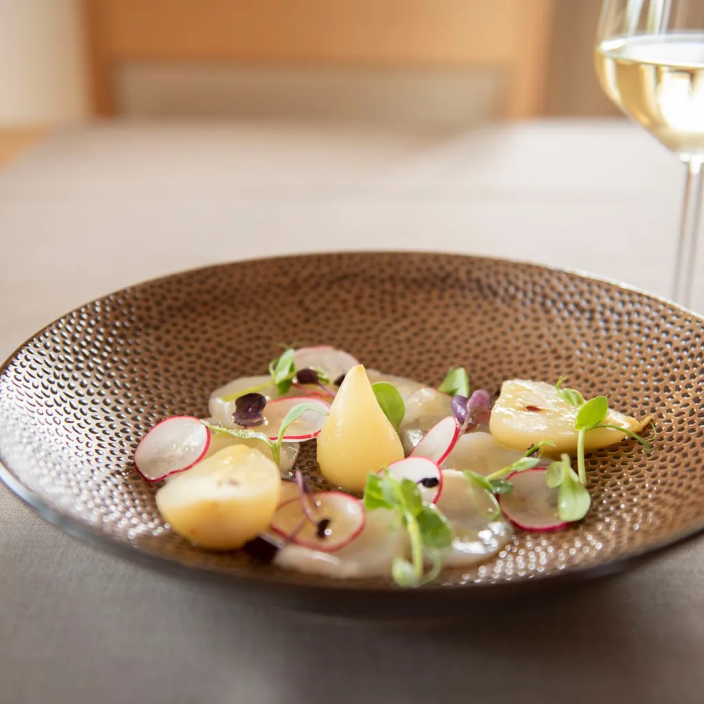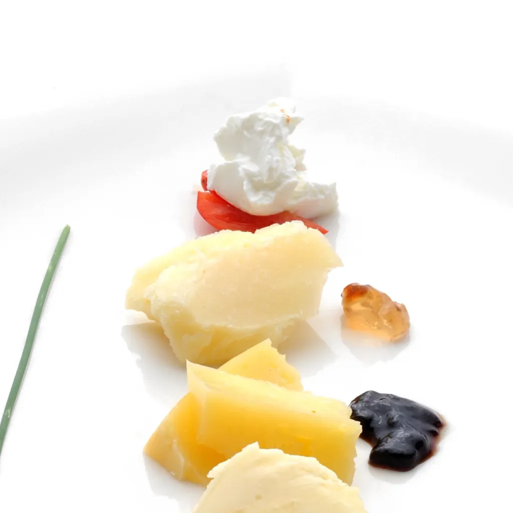 - Goveji karpačo / staran sir, vložen topinambur in gorčični preliv