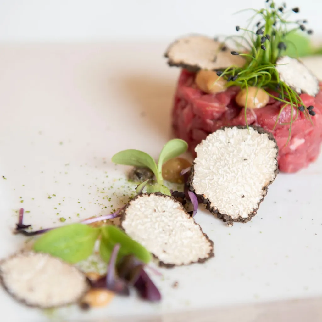 - Tartar iz tune sashimi / redkvica, gorčična semena, mikro zelenje in sveži tartuf